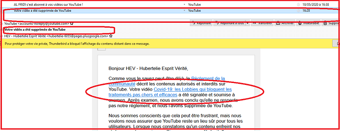 "Votre contenu a été supprimé de Youtube pour non respect des conditions d'utilisation"...