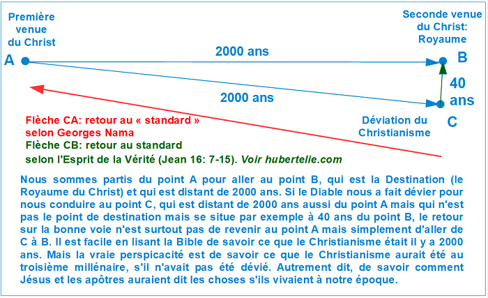 Dans le document PDF Retour au standard de la Parole de Dieu selon Georges Nama vs le standard selon l'Esprit de la Vérité, j'explique aussi l'une des graves conséquences d'avoir une compréhension rétrograde de la Bible. Entre autres raisons, cela ne peut que conduire à rater le rendez-vous de ce qu'on appelle communément le Retour du Christ, car les esprits formatés dans une compréhension rétrograde attendent un Jésus Christ comme il est apparu il y a 2000 ans, parlant un langage d'il y a 2000 ans, etc., et pas un Jésus Christ ou son précurseur apparaissant et disant les choses avec un langage de notre époque.